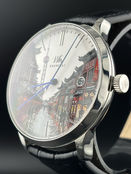 这款简约的包豪斯风格腕表尺寸为 41 毫米,其中大部分都用于表盘。这为更精致的设计创造了额外的空间。目标是营造出上海的印象,展示新旧对比 ,背景是老街道和明珠塔。氛围可能是 20 世纪 20 年代烟雾缭绕的工业时期,也可能是 2020 年代的雨天。挑战还在于提供规模和对比,以便城市易于辨认,让您感觉仿佛可以走进表盘。